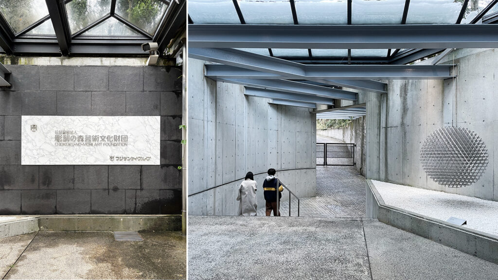 彫刻の森美術館のエントランス外観。美術館はなだらかに下る傾斜地に位置しており、正面にみえるゲートの奥に設けられたエスカレーターで下った先の低地に展示室や屋外展示場が広がっている。高低差をうまく活用することで美術館の内外が分けられており、ゲートを潜った先ではじめて美術館内を目にすることができる