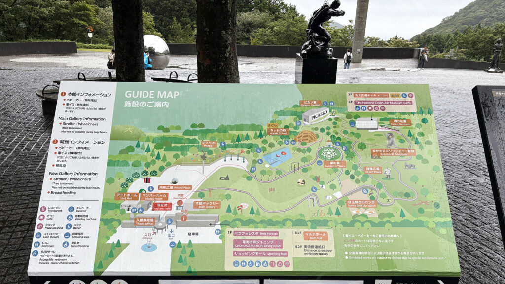 彫刻の森美術館の案内図。左下がエントランス。広大な土地に多くの彫刻や展示室が点在している