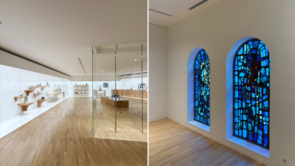 ピカソ館内観。一面白の空間に色鮮やかなステンドグラスが映える