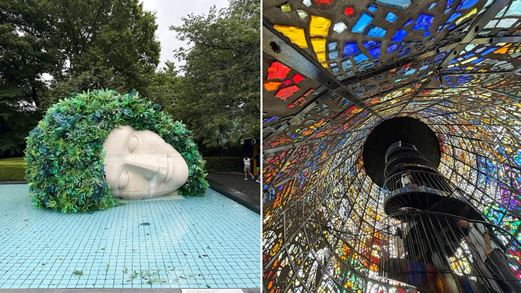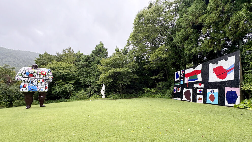 屋外展示場。左に見えるのはニキ・ド・サン・ファール氏による《ミス・ブラックパワー》、右に見えるのは猪熊弦一郎氏による《音の世界》。著名な美術家による作品がそこかしこに置かれている