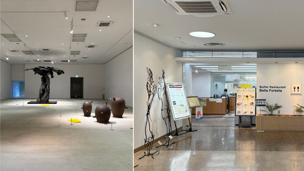 左:美術館を出る際に経由するマルチホールにも巨大な作品3点が常設展示されている/右:彫刻の森美術館のビュッフェレストラン。ショップやレストランは美術館へのゲート手前にも出入口が設けられており、単独での利用も可能