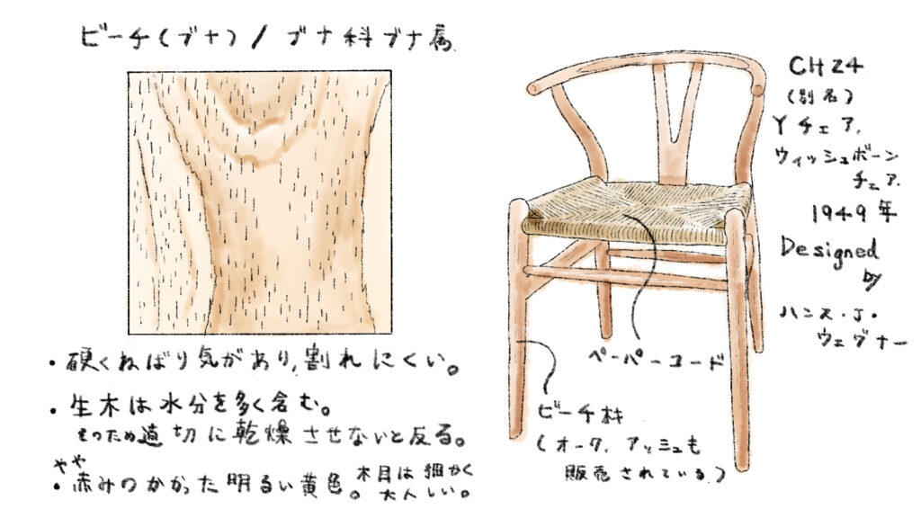 ハンス・J・ウェグナーのデザインした北欧家具の代表的存在、《CH24》(ウィッシュボーンチェア、Yチェア)に使われていることで有名なビーチ材。近年だと、世界的に有名な建築家ユニット、SANAAのデザインしたマルニ木工の椅子《SANAAチェア》などにも使われています。