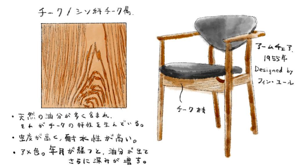 世界三大銘木のひとつで、高級木材ともいわれるチーク材。フィン・ユールのデザインした《エジプシャンチェア》や、その他ヴィンテージ家具に使われている例はよく見かけますが、現代の家具で見かけることはそう多くはない印象があります。