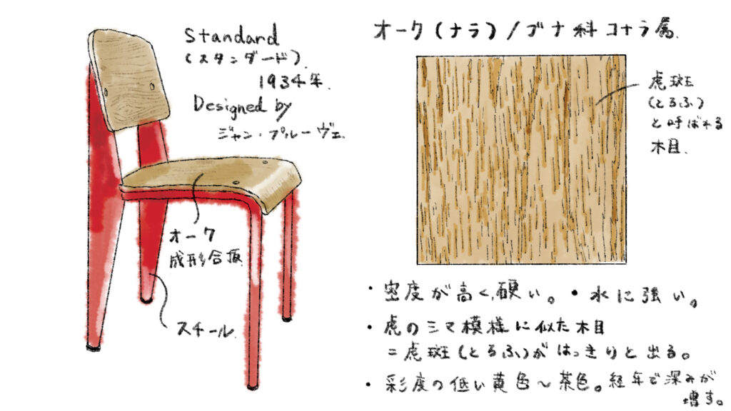 ジャン・プルーヴェがデザインした《スタンダード》やハンス・J・ウェグナーがデザインした《ヴァレットチェア JH540》など、20世紀中頃にデザインされた家具に多用されているオーク材。日本国内ではナラ材とも呼ばれますが、木材を構成する組織の密度が高いために硬く丈夫で、長い年月を生き残ってきたヴィンテージ家具でもしばしば見かけます。